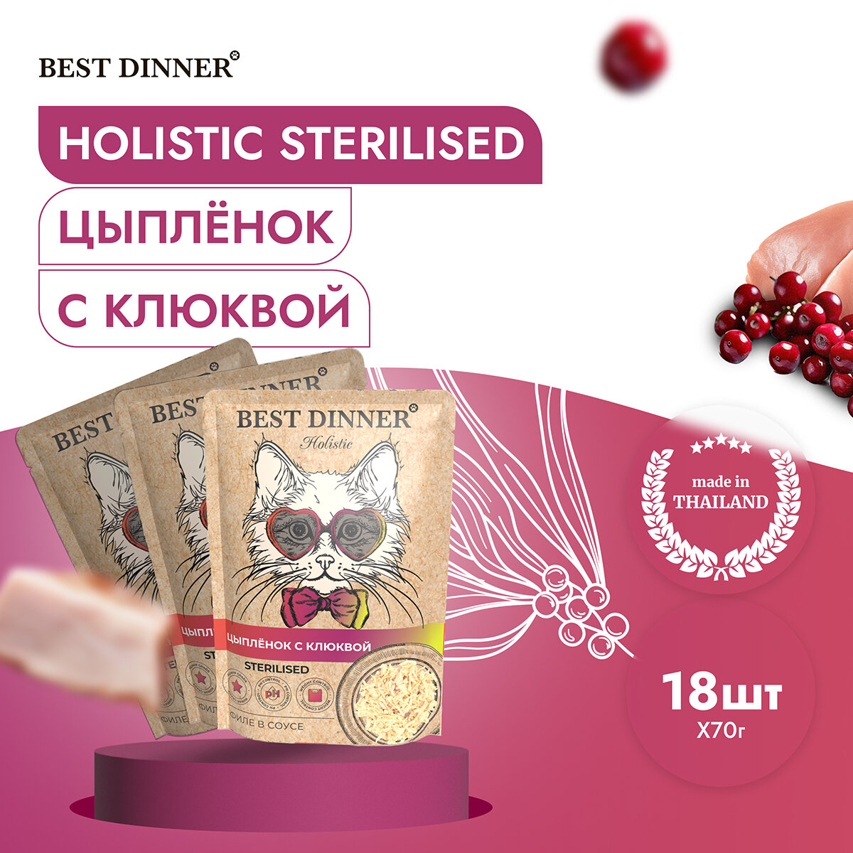 BEST DINNER HOLISTIC STERILISED для кастрированных котов и стерилизованных кошек с цыпленком и клюквой в соусе (70 гр х 18 шт)