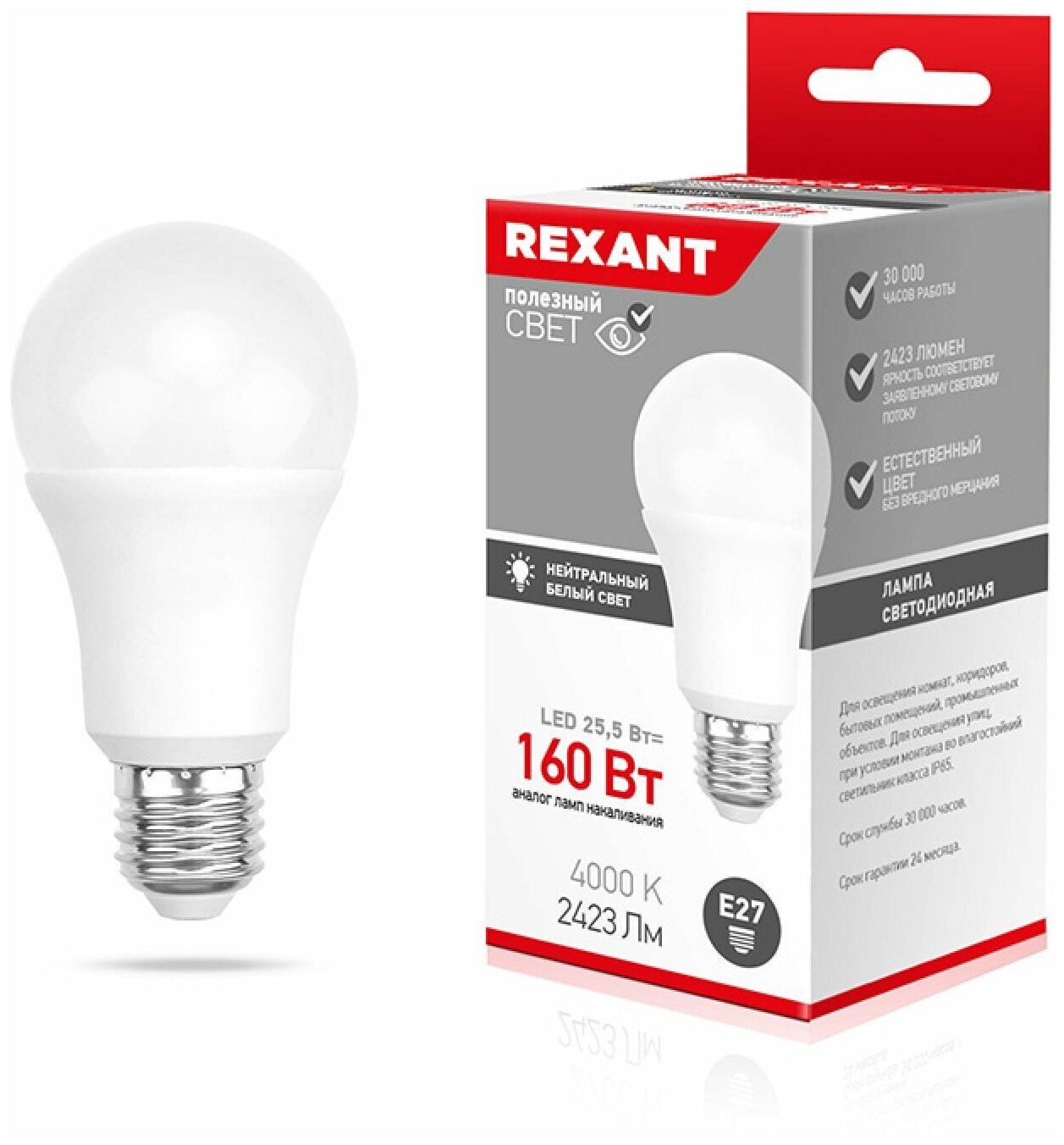 Отзывы на Светодиодная лампа REXANT Груша A60 25,5 Вт E27 2423 лм 4000 K нейтральный свет 604-016