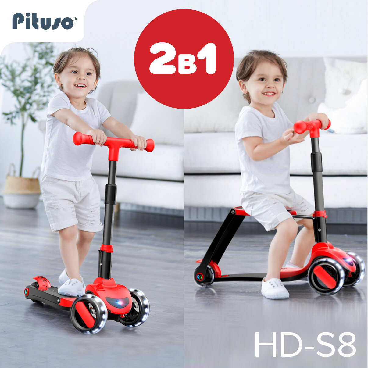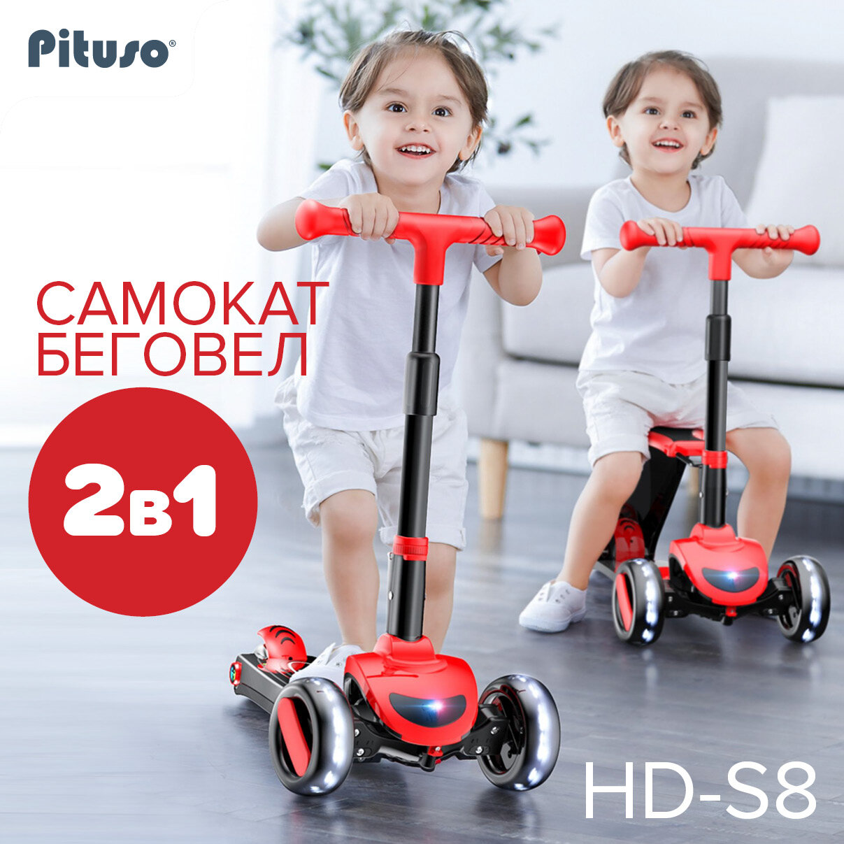 Трехколесный самокат Pituso 2в1 HD-S8 Red /красный детский подарок беговел велобег 3-х колесный складной