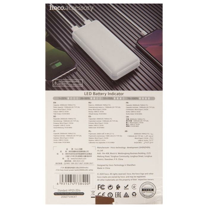 Внешний аккумулятор HOCO J72A Easy travel, 2.0A, 20000mAh, белый (мятая упаковка) информация: