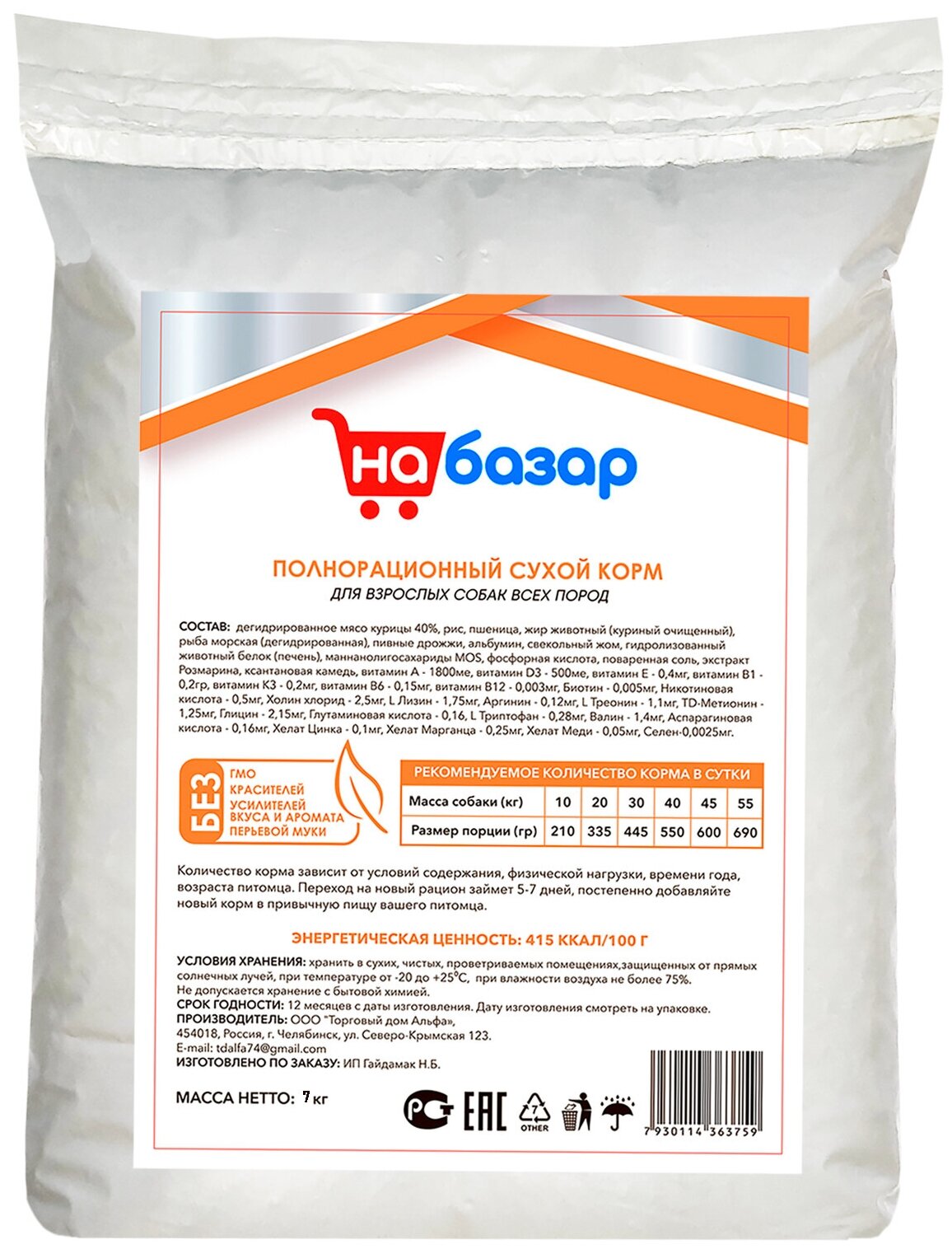 Сухой корм для взрослых собак всех пород / Супер-Премиум класса "на базар" с мясом курицы и рисом 7 кг информация: