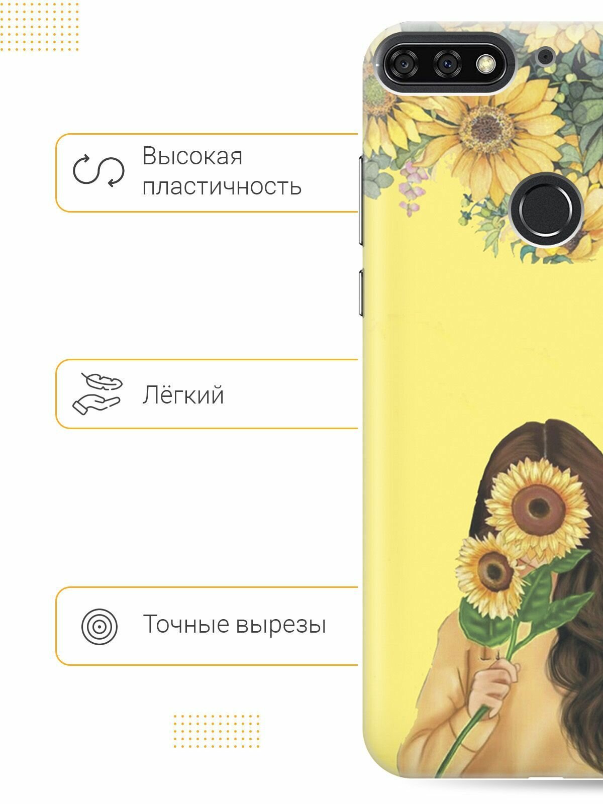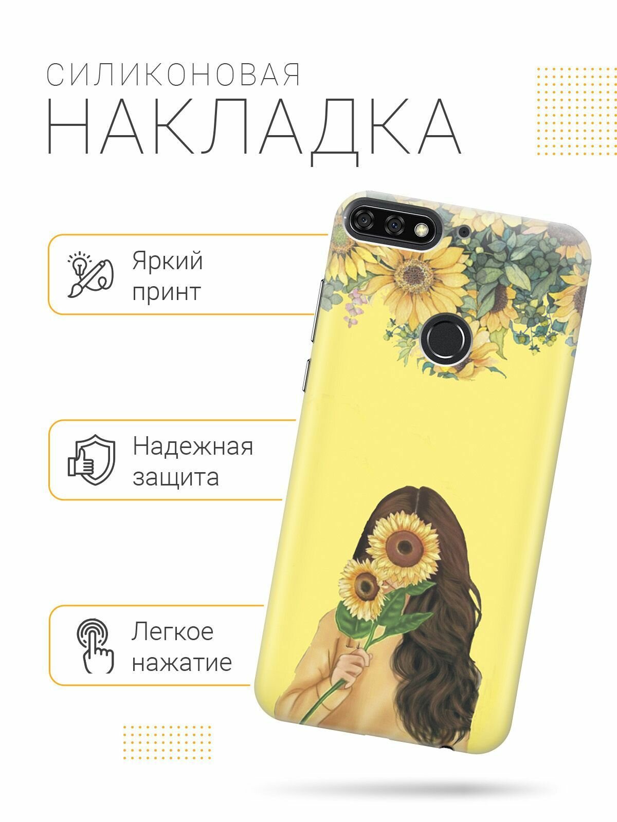 Силиконовый чехол на Honor 7C / 7A Pro / Huawei Y6 Prime (2018) / Хуавей У6 Прайм 2018 / Хонор 7А Про / 7С с принтом "Девушка и подсолнухи" информация:
