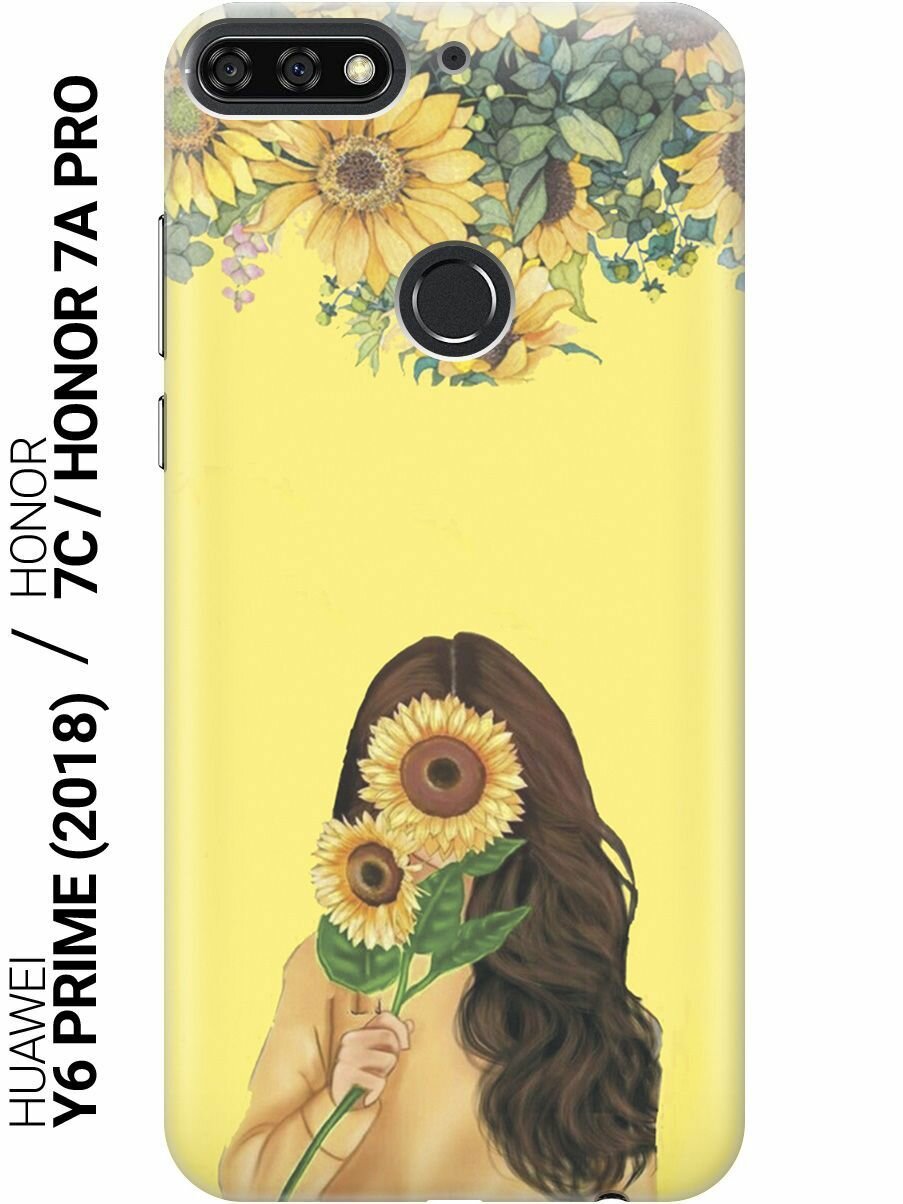 Силиконовый чехол на Honor 7C, 7A Pro, Huawei Y6 Prime (2018), Хуавей У6 Прайм 2018, Хонор 7А Про, 7С с принтом "Девушка и подсолнухи" 459 ₽