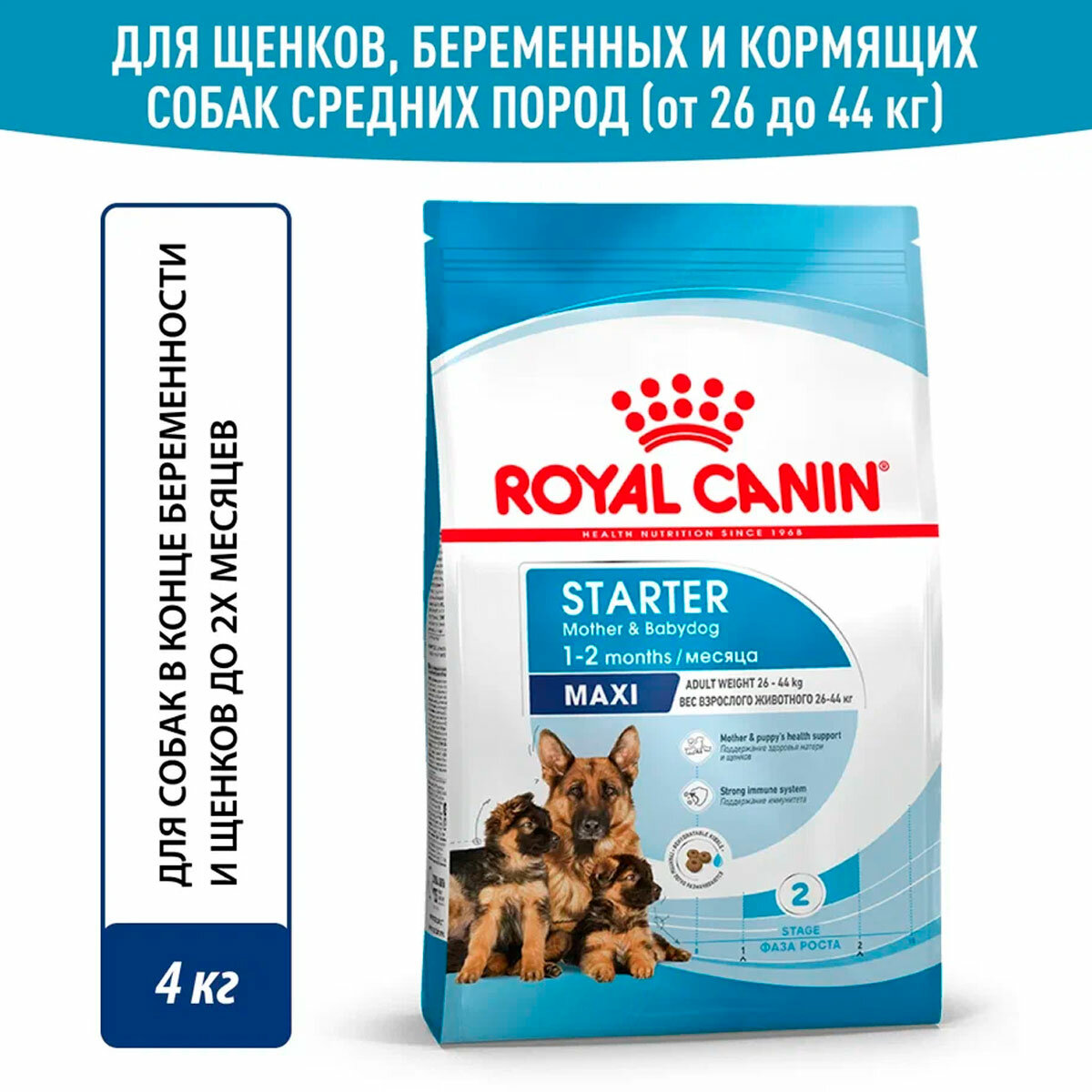Сухой корм ROYAL CANIN MAXI STARTER для щенков крупных пород до 2 месяцев, беременных и кормящих сук (4 + 4 кг) информация: