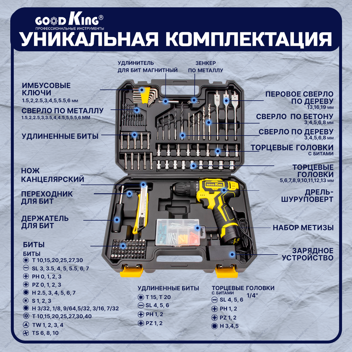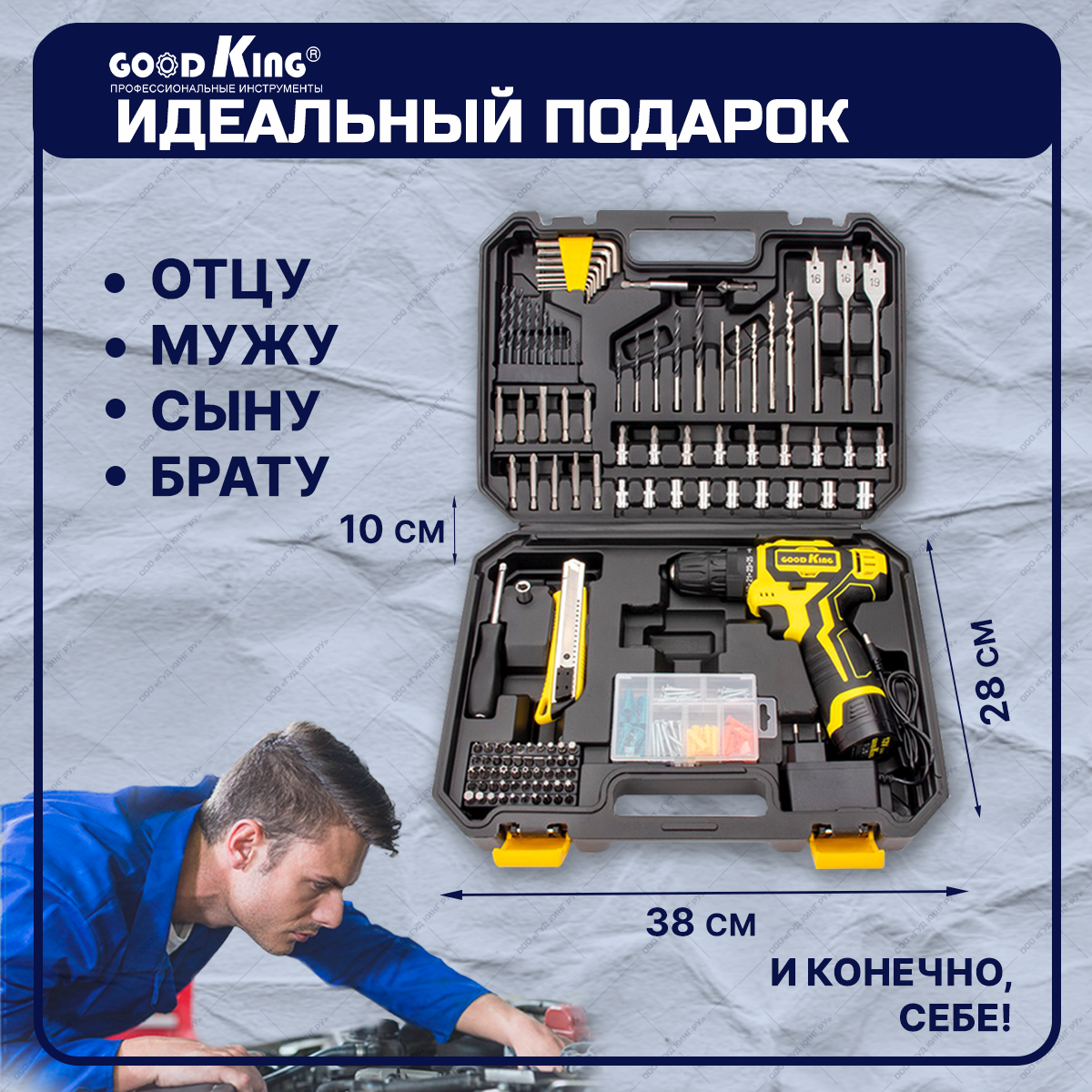 10 цен на Аккумуляторная дрель-шуруповерт GOODKING EC-1201193 с набором инструментов 193 предмета