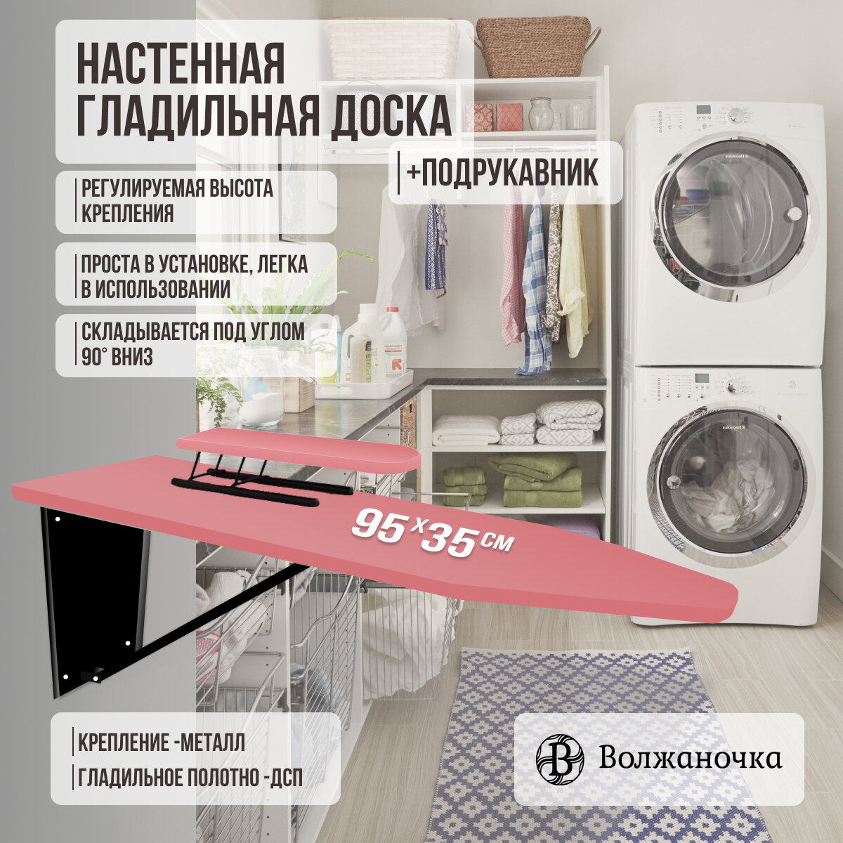 Волжаночка Гладильная доска настенная с подрукавником, размер 95х35см., цвет светло-розовый 3 617 ₽