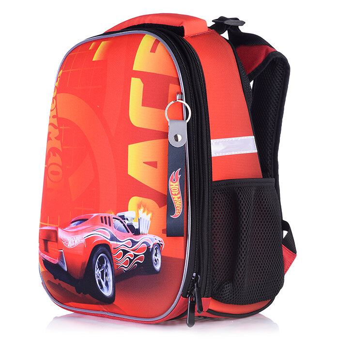 Рюкзак каркасный "Hot Wheels" формованный из полимеров, материал: нейлон, полиэстер, полноцветная печать, вышивка, аппликация. 2 отделения на молнии, 2 бегунка на каждой молнии, 2 боковых кармана, светоотражатели , жесткая эргономичная спинка; широкие, р