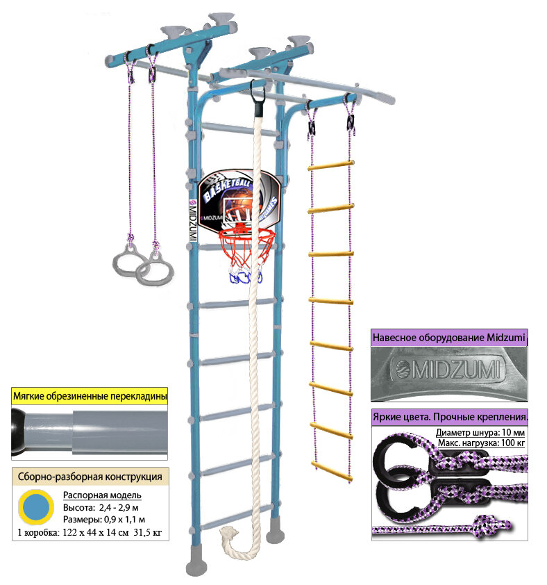 | Комплектация | веревочная лестница, канат, гимнастические кольца, баскетбольный щит с мячом |