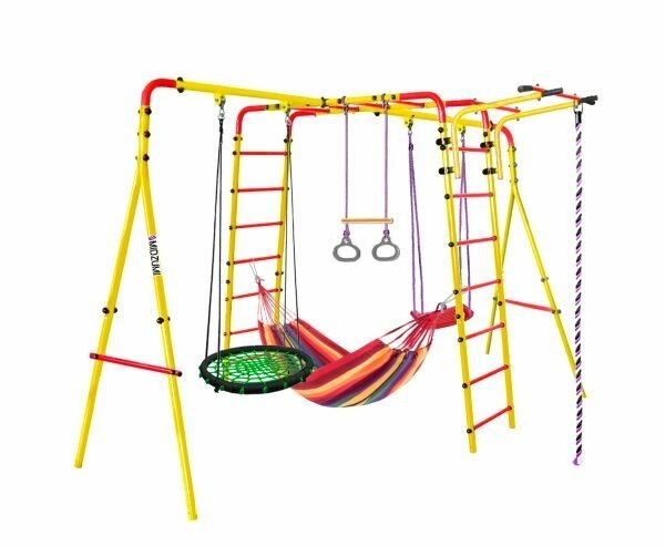 | Комплектация | спортивный комплекс с рукоходом, передвижной турник, кольца с перекладиной, подвесные качели - гнездо, пластиковые качели без спинки, подвесной гамак, канат |