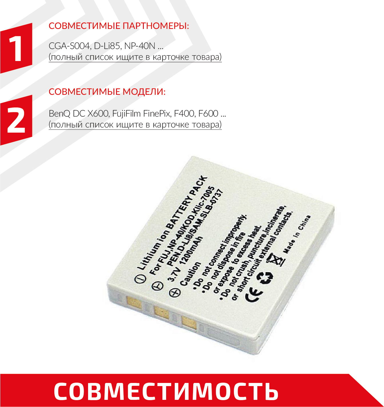 | Совместимый аккумулятор | CS-NP40FU / D-Li8 / D-Li85 / KLIC-7005 / NP-40 / NP-40N / SLB-0737 / B-9618 / DLi-102 / PVB-206 |