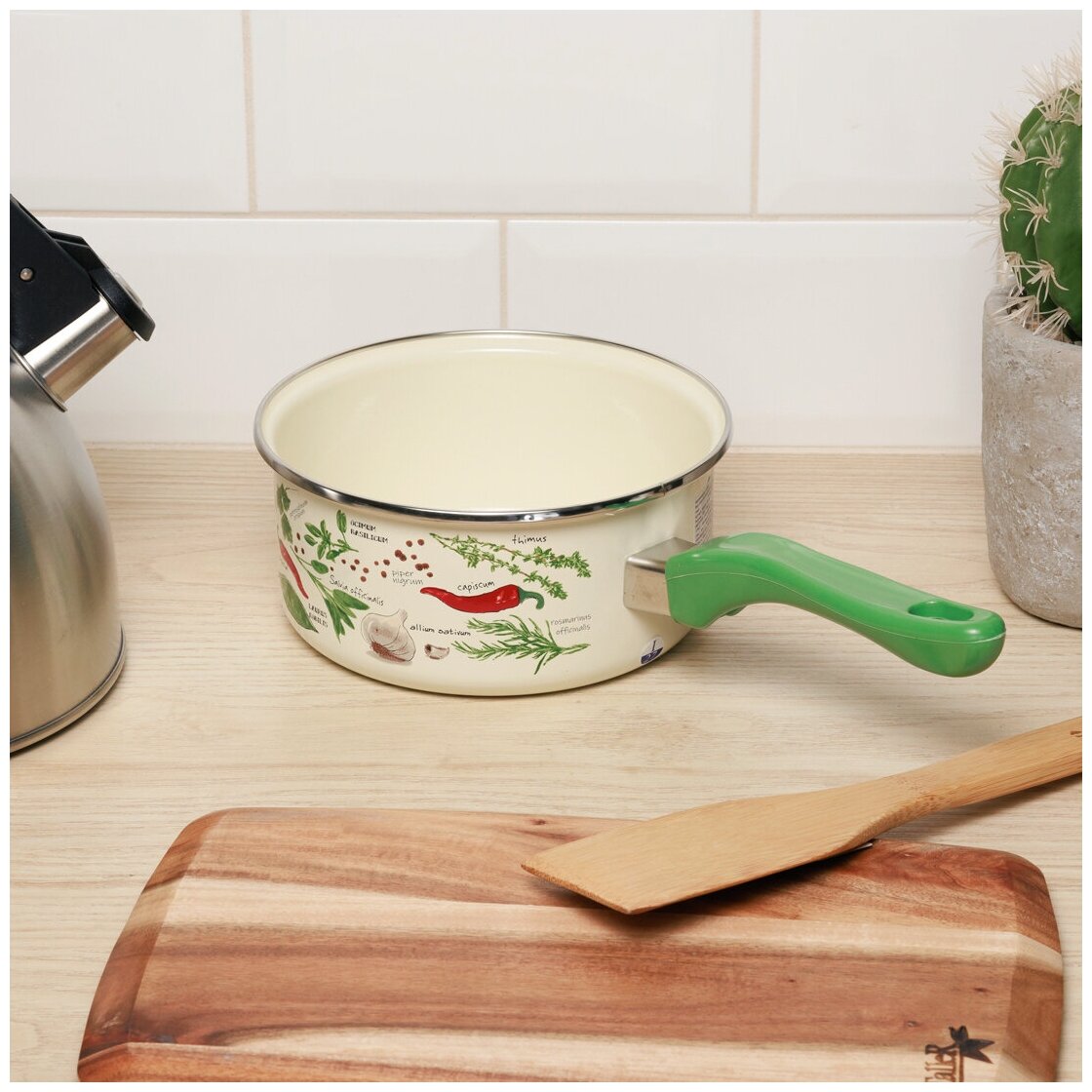 Кастрюля эмалированная 1,5 л с ободком белая с рисунком Фруктовая фантазия