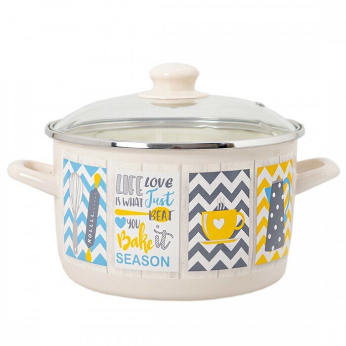 Кастрюля эмалированная 1,5 л с ободком белая с рисунком Фруктовая фантазия