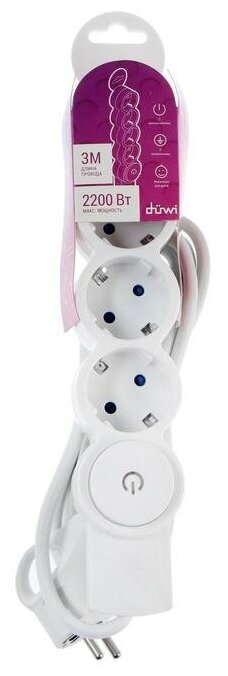 Удлинитель Duwi, 3 розетки, 3 м, 10 А, 2200 Вт, ПВС 3х0.75 мм2, с з/к, белый