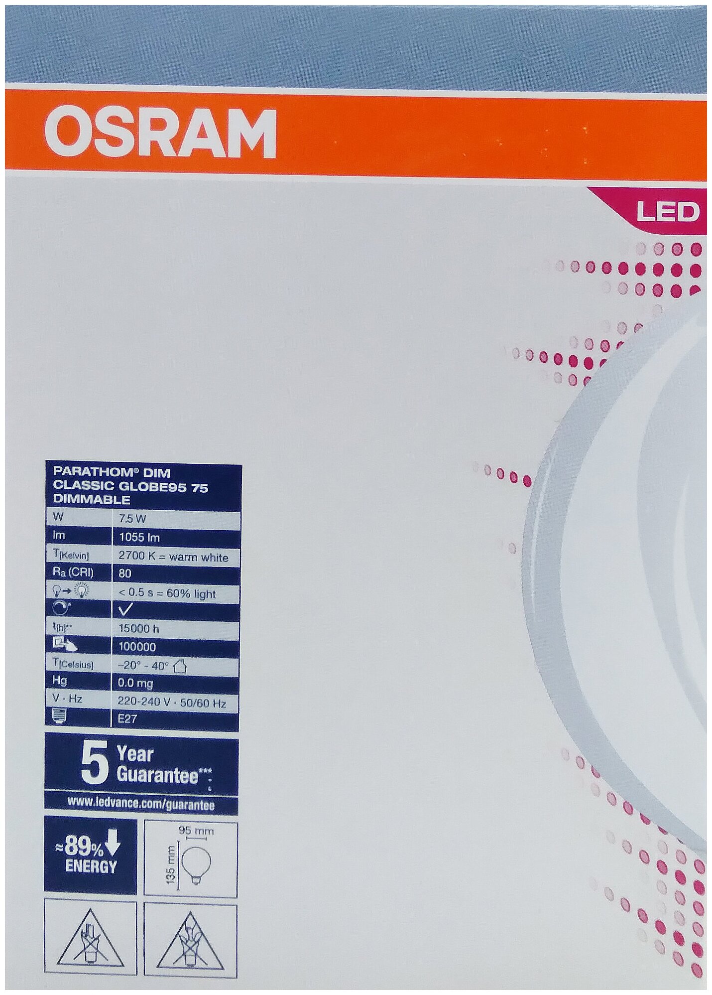 Лампочка светодиодная Osram филаментная стекло Шар G95 E27 Диммируемая 7,5Вт 220В 1055Лм 2700К Теплый белый, упаковка 1шт информация: