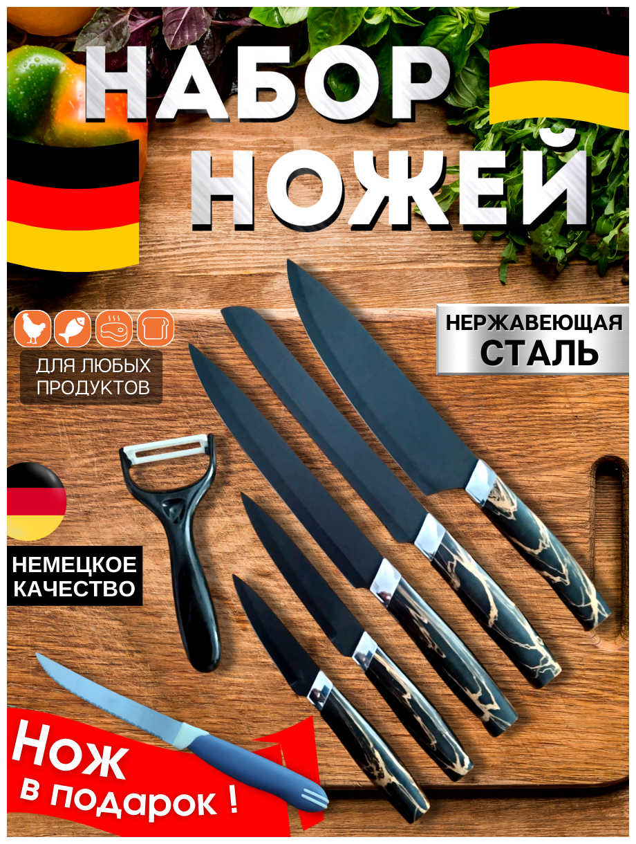 | Комплектация | 5 ножей, 1 овощечиска, 1 нож в подарок. |