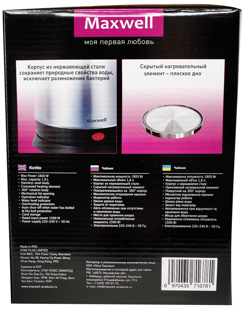 Чайник Maxwell Мощность 1500 Вт.Максимальный объем 1,8 л.Корпус из нержавеющей стали.