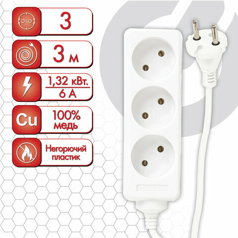 Удлинитель SONNEN U-131, 3 розетки, 1.8 м, б/з, 6А / 1320 Вт