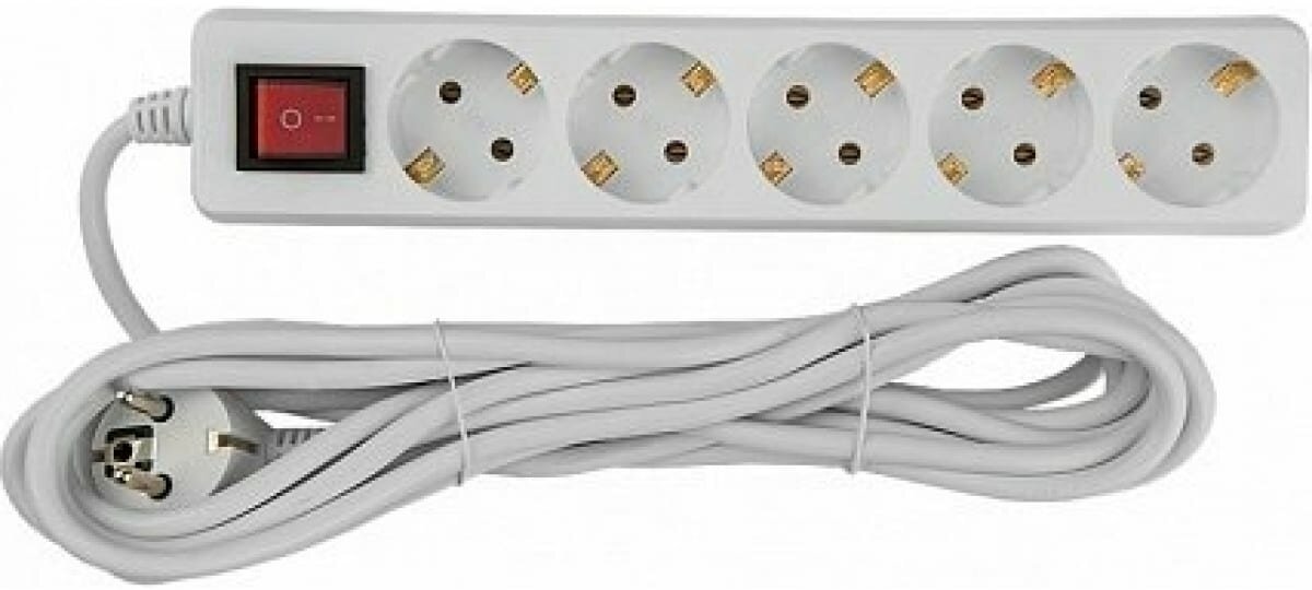 Удлинитель бытовой GES-10-2x075-5-5m, 10А, 2х0,75 мм2, 5 мест, 5 метров, без заземления