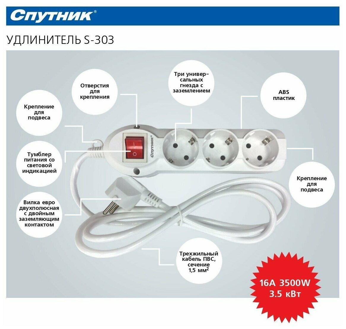 10 цен на Сетевой удлинитель Спутник S-303 3м