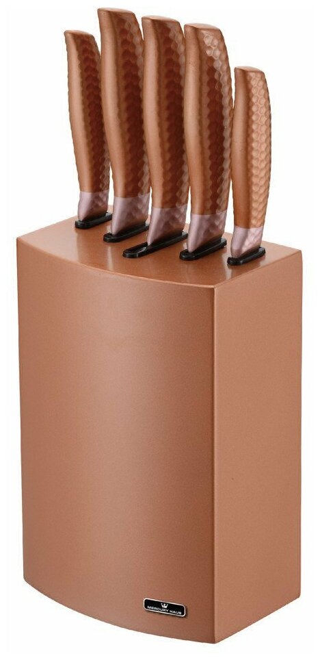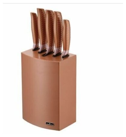 | Комплектация | В наборе: поварской нож (20 см), нож для хлеба (20 см), нож для нарезки (20 см), универсальный нож (12.5 см), нож для чистки овощей (9 см), подставка для ножей. |