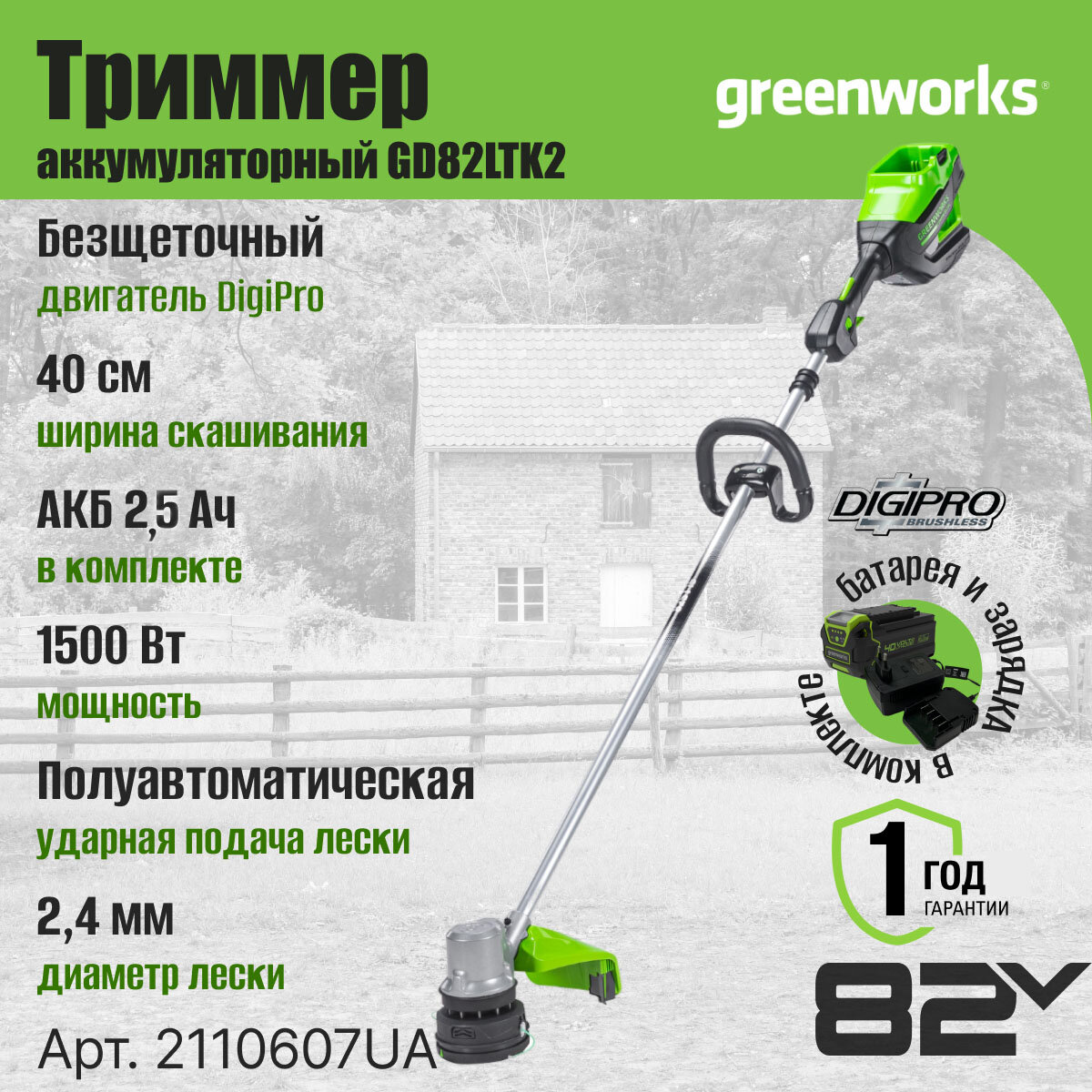 GreenWorks GD82LTk2, 82V, 40 см, бесщеточный, с 1хАКБ 2.5 Ач. и ЗУ Триммер аккумуляторный (2110607UA)