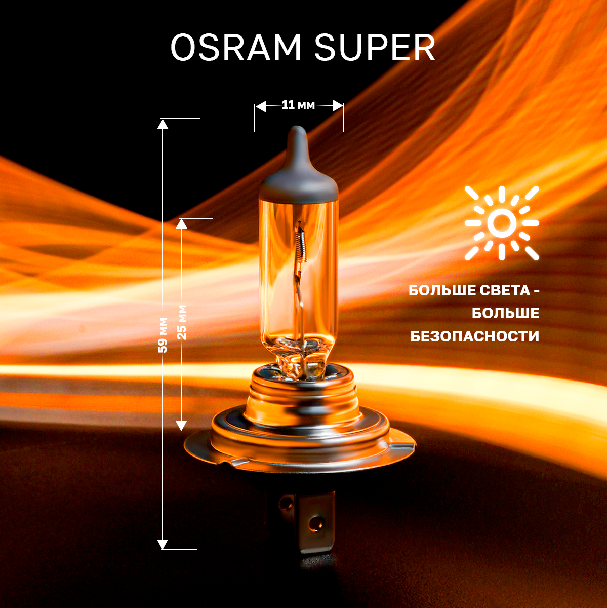 Лампа галогеновая автомобильная H7 OSRAM SUPER 12В 55Вт на 30% больше света Для ближнего и дальнего света 2 шт информация:
