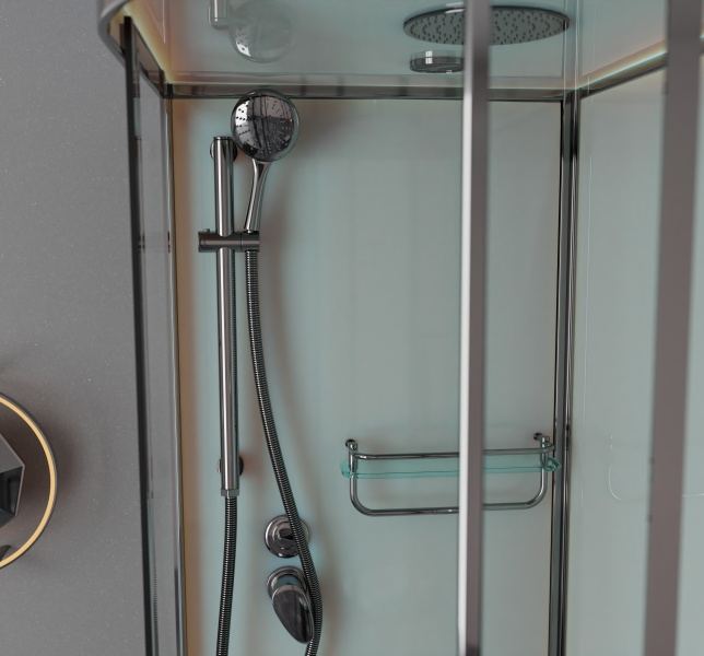 | Дополнительная информация | материал профилей: полированная сталь (полированный хром), колба сифона: ширина 90 мм (с ловушкой для волос и гидрозатвором), закалённые стёкла, безсиликоновая сборка, резьбовые соединения смесителя с душем, верхний душ (с резиновыми соплами от известков |