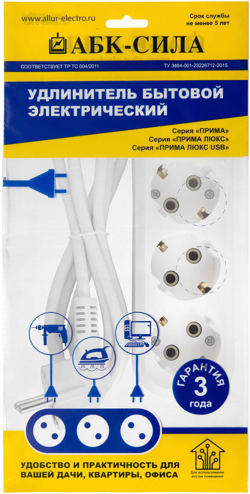 Удлинитель бытовой, сетевой фильтр абк-сила, 3 гнезда, с заземлением, 1,5м, ПВС 3х1мм кв. 16А/220В информация: