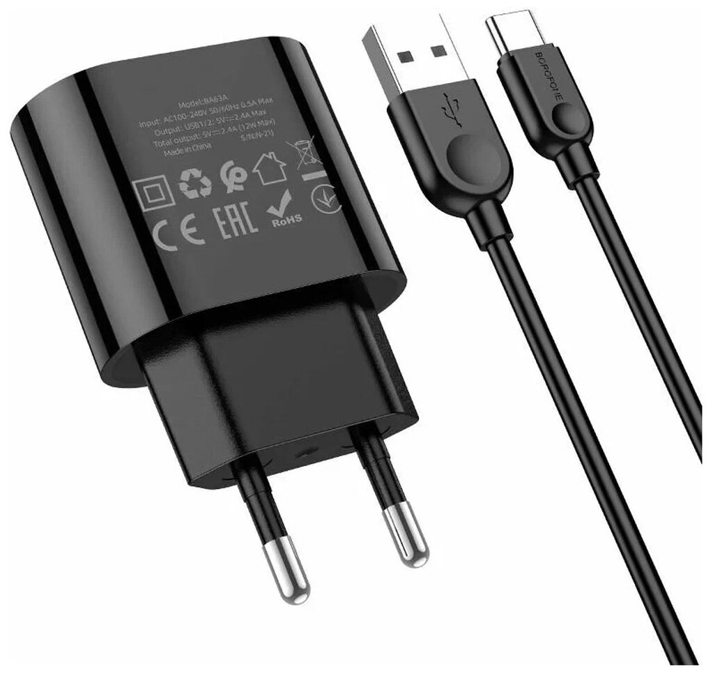 Зарядное устройство BA63A / Набор с кабелем Type-C / с двумя выходами USB 2.4A / Цифровой дисплей / чёрный информация: