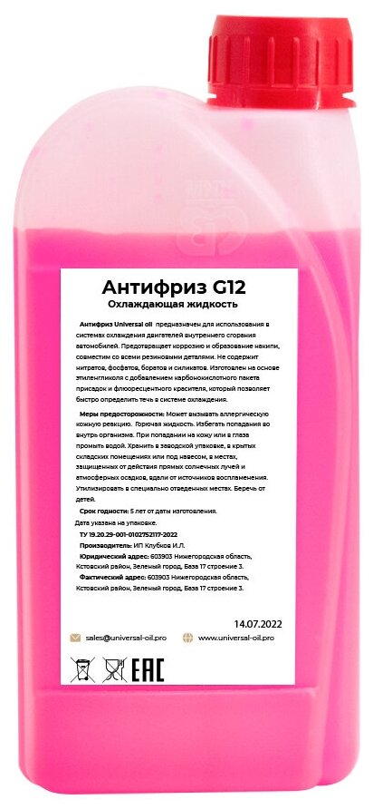 Антифриз красный G12 универсальный готовый к применению 1 кг информация: