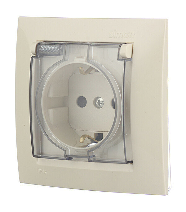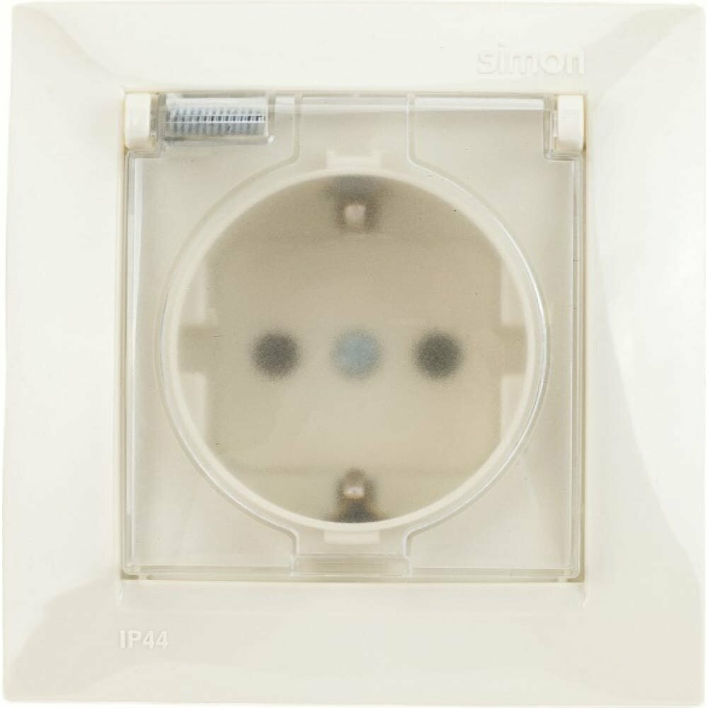Розетка с рамкой Simon 15 1590450-031 скрытая установка слоновая кость с заземлением IP44 с крышкой со шторками информация: