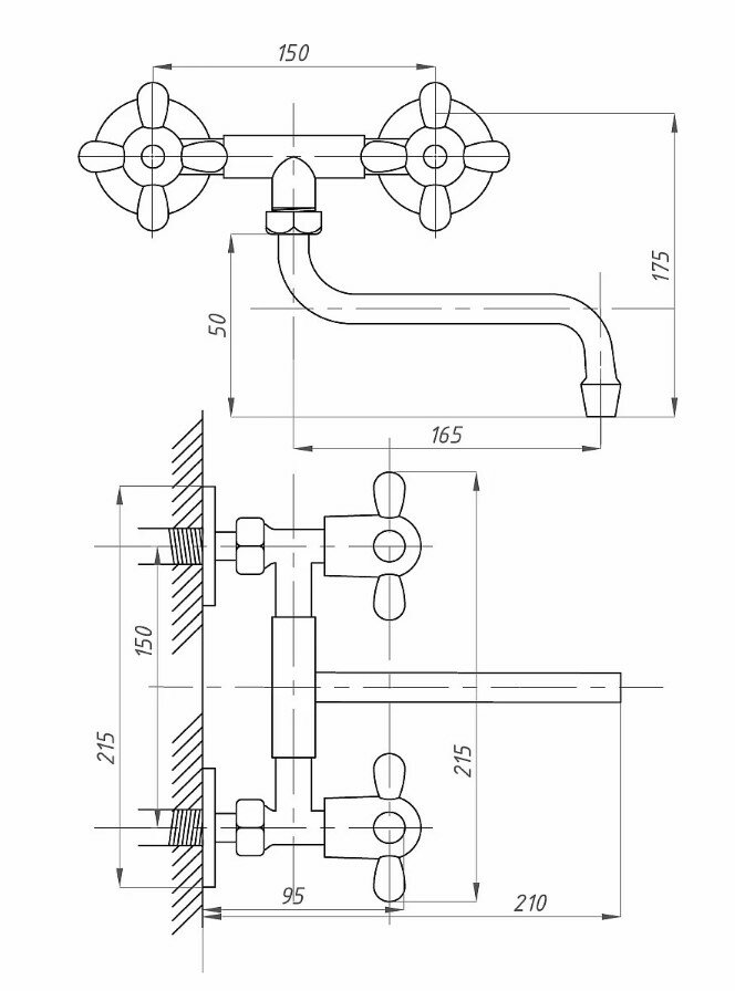 Смеситель на раковину настенный Эверест B46-350 с круглым поворотным изливом, кран-буксы 1/2", хром