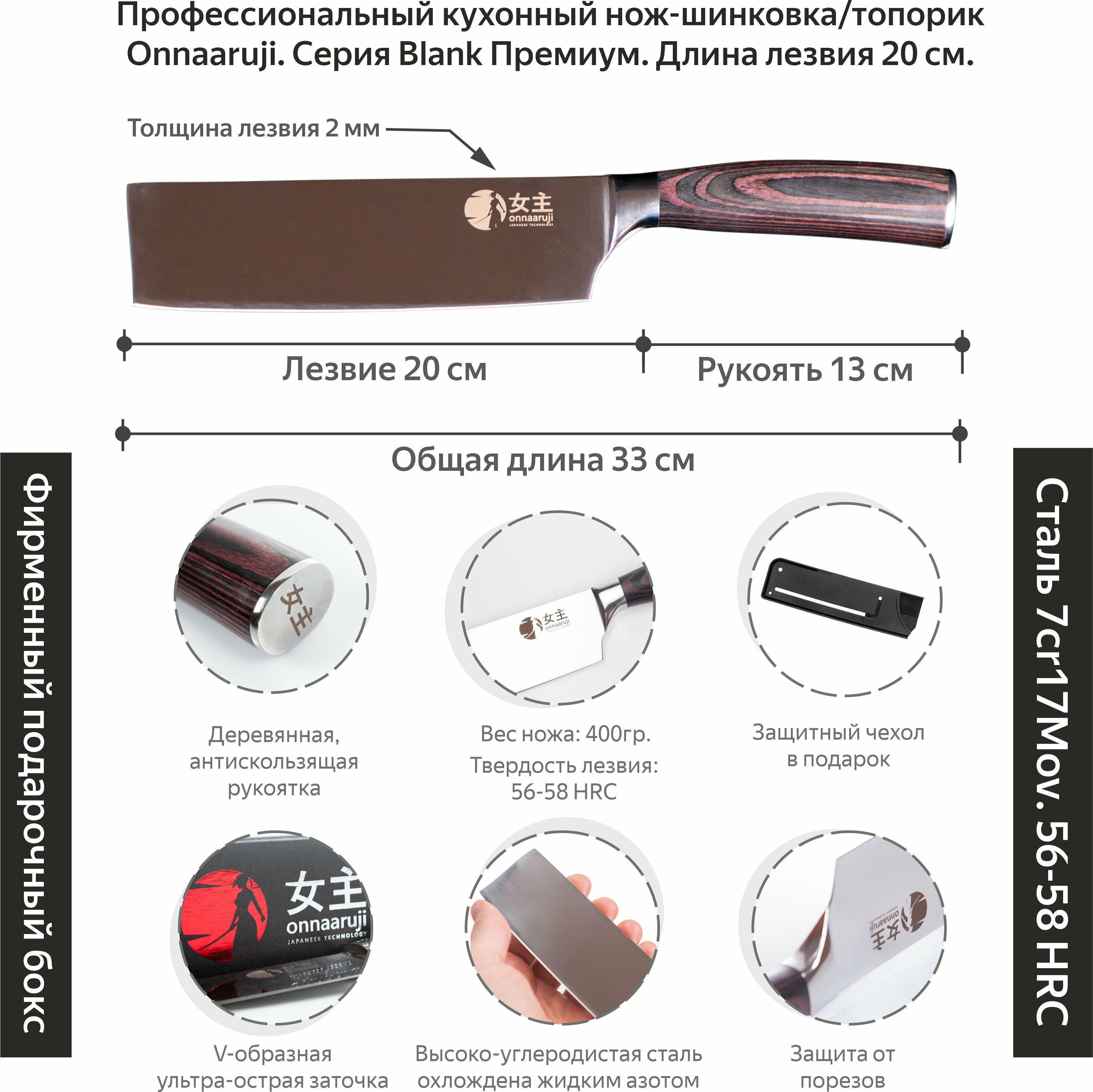 | Дополнительная информация | Пожизненная гарантия на материал. Все ножи Onnaaruji проходят ручной контроль качества. Также все ножи поставляются в модном подарочном боксе |