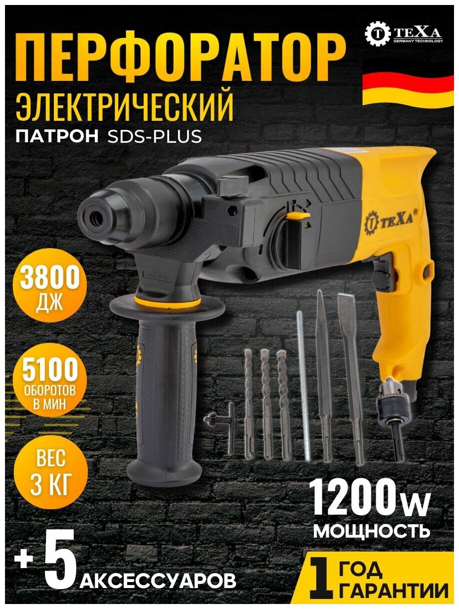 Перфоратор сетевой электрический 1200 Вт, 3.8 Дж, 5100 об/мин, кейс+набор долот и буров, ударная дрель, SDS Plus информация: