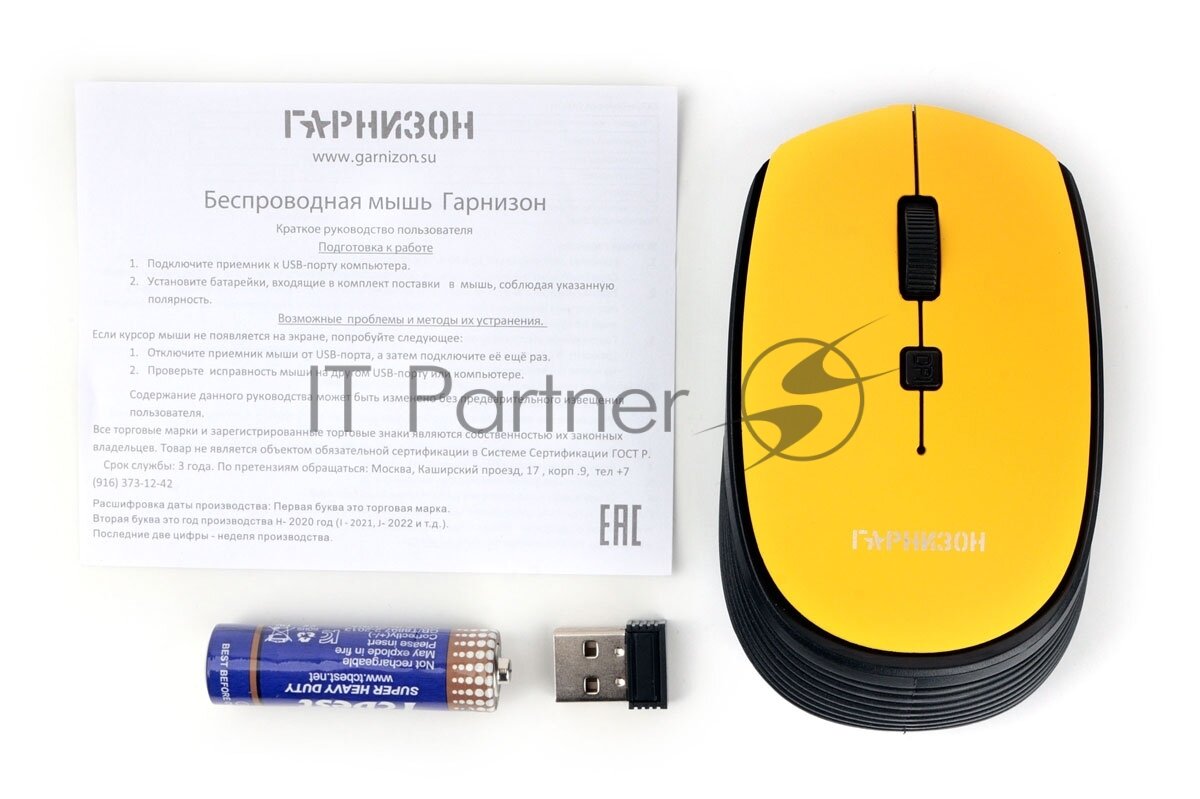 Мышь беспроводная Гарнизон GMW-550-1, жёлтый, 1000 DPI, 2 кн.+ колесо-кнопка информация: