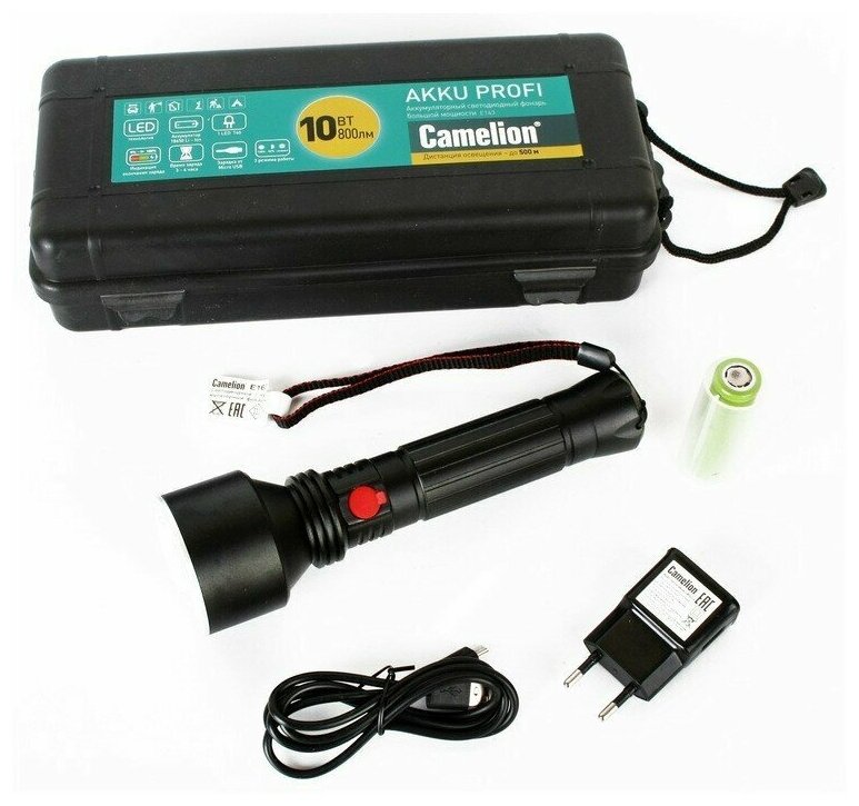 10 цен на Camelion E163 (фонарь аккум. 3,7В, черный, T40 LED, 10 Ватт, 3 реж., алюминий, бокс)
