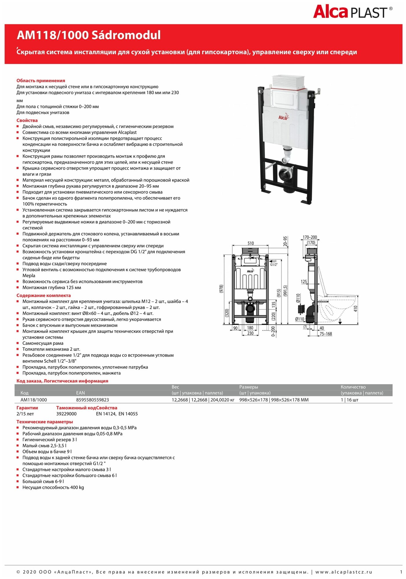 Инсталляция для унитазов AlcaPlast Sadromodul AM118/1000 информация: