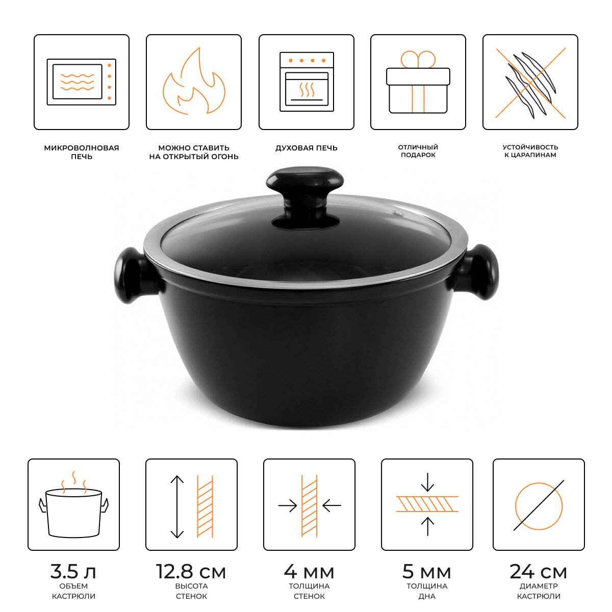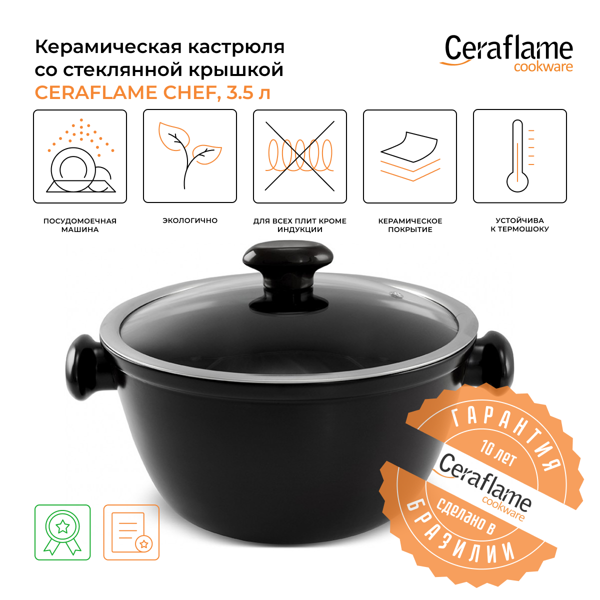 Кастрюля керамическая со стеклянной крышкой Ceraflame Chef 24 см, 3.5 л чёрная информация: