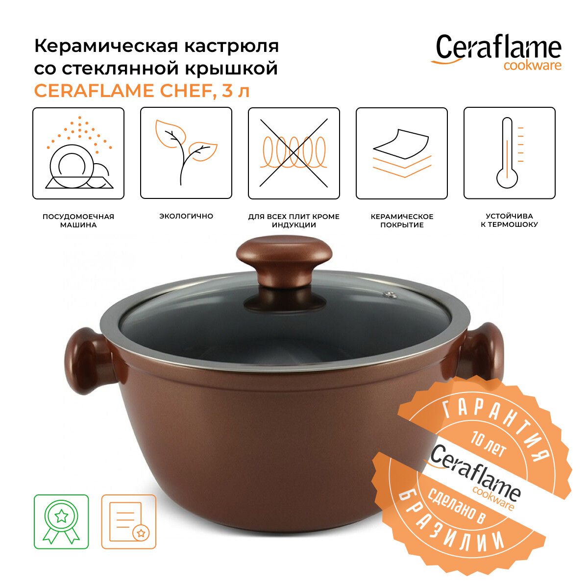 Кастрюля керамическая со стеклянной крышкой Ceraflame Chef 22 см, 3 л медный информация: