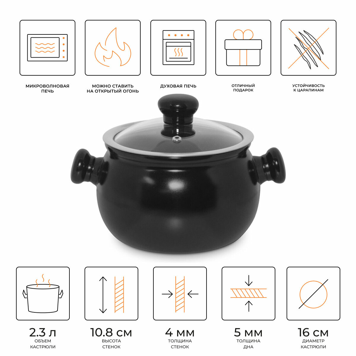 Кастрюля керамическая со стеклянной крышкой Ceraflame Premiere 16 см, 2.3 л, чёрный информация: