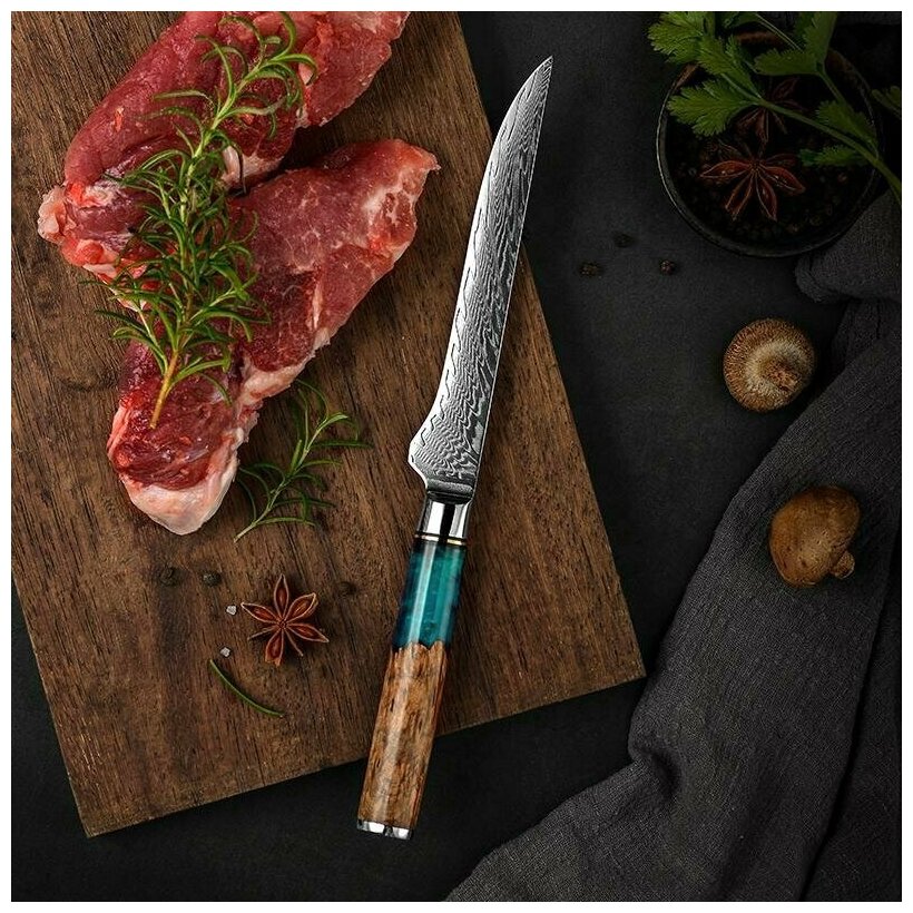 Кухонный обвалочный нож TuoTown BO150 TWB-D4, рукоять синий акрил+дерево, клинок 15см (VG10-Damascus). информация: