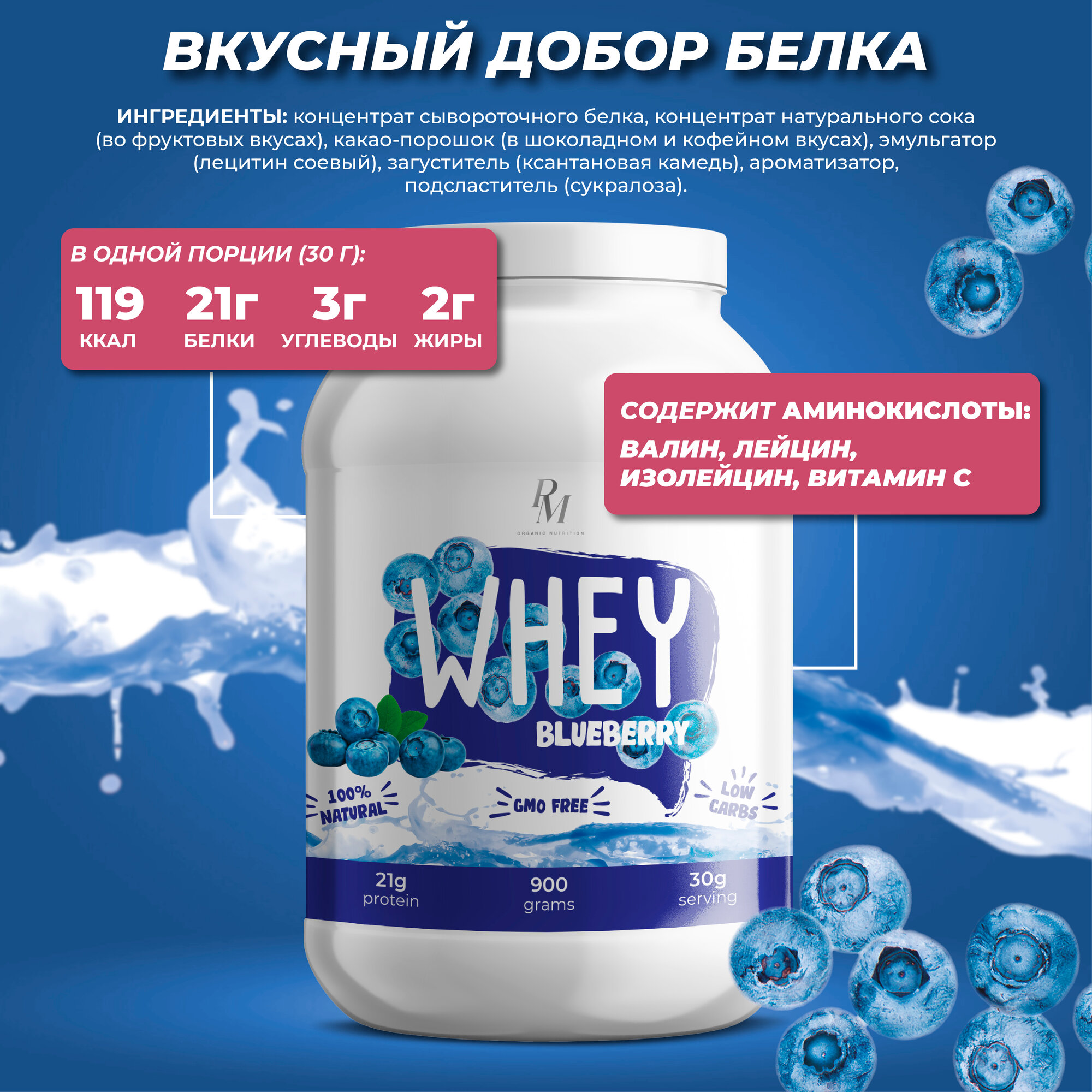 Протеин Whey PM-organic nutrition, 900 гр, черника информация: