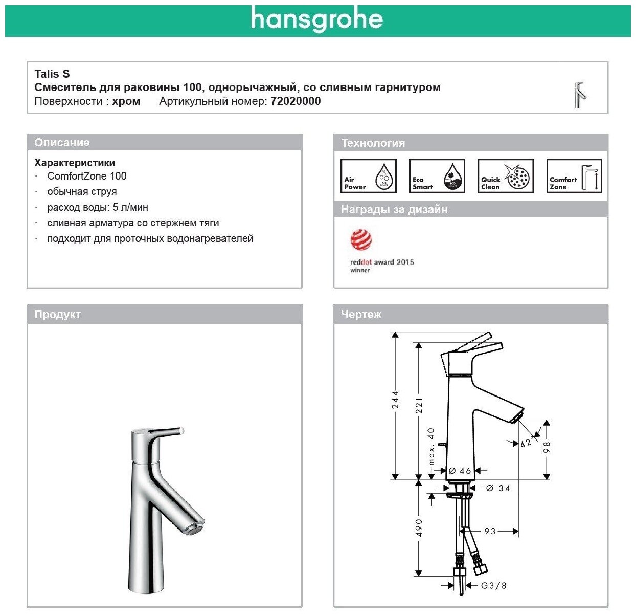 Смеситель для раковины (умывальника) hansgrohe Talis S 72020000 информация: