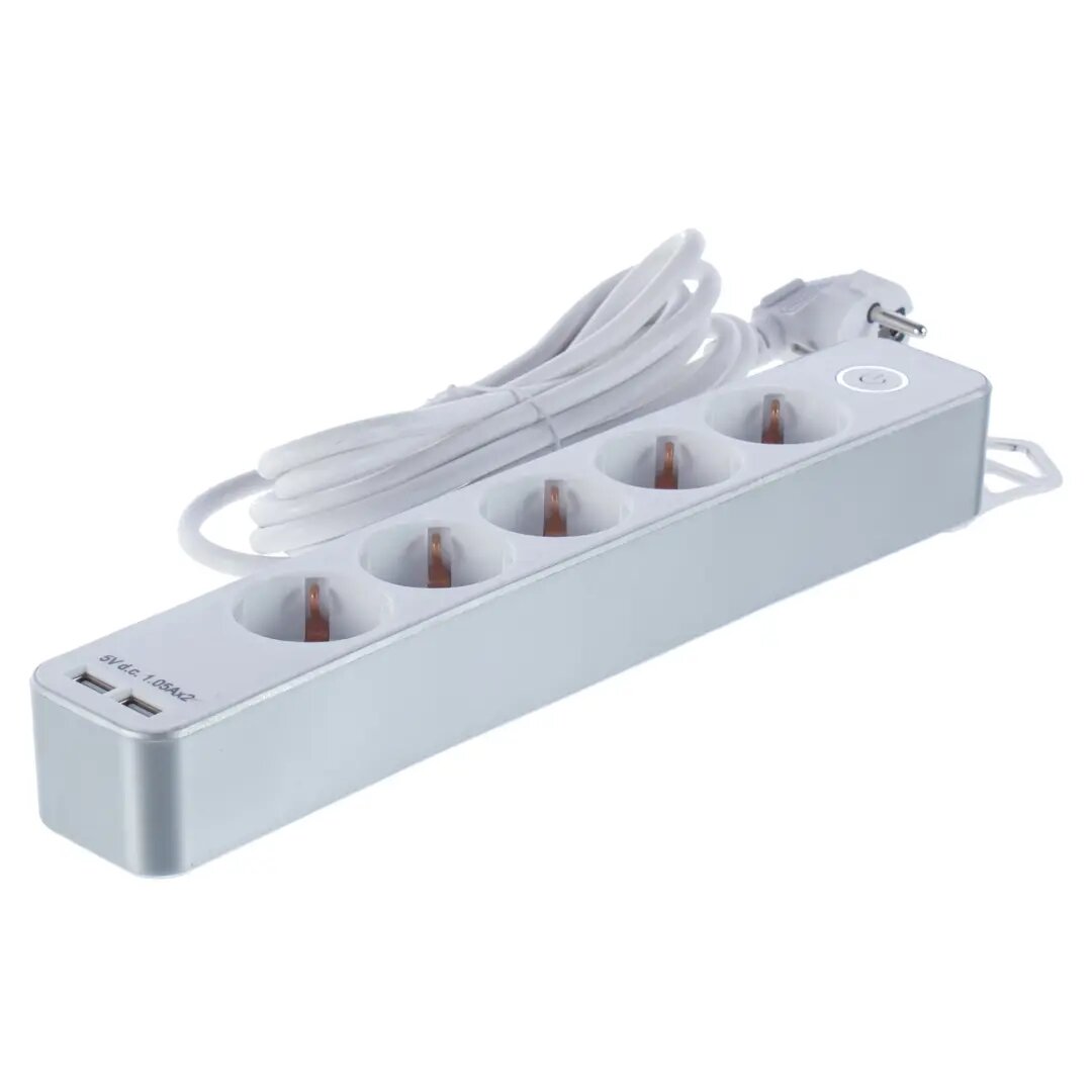 Удлинитель с заземлением на 5 розеток 3 м кнопка 2 USB цвет серебро информация: