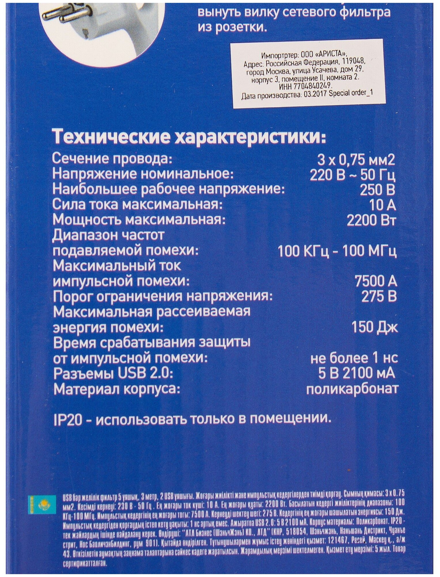 Отзывы на Сетевой фильтр Эра SFU 5 розеток с заземлением 3х0.75 мм 2 USB 2200 Вт 3 м цвет бежевый