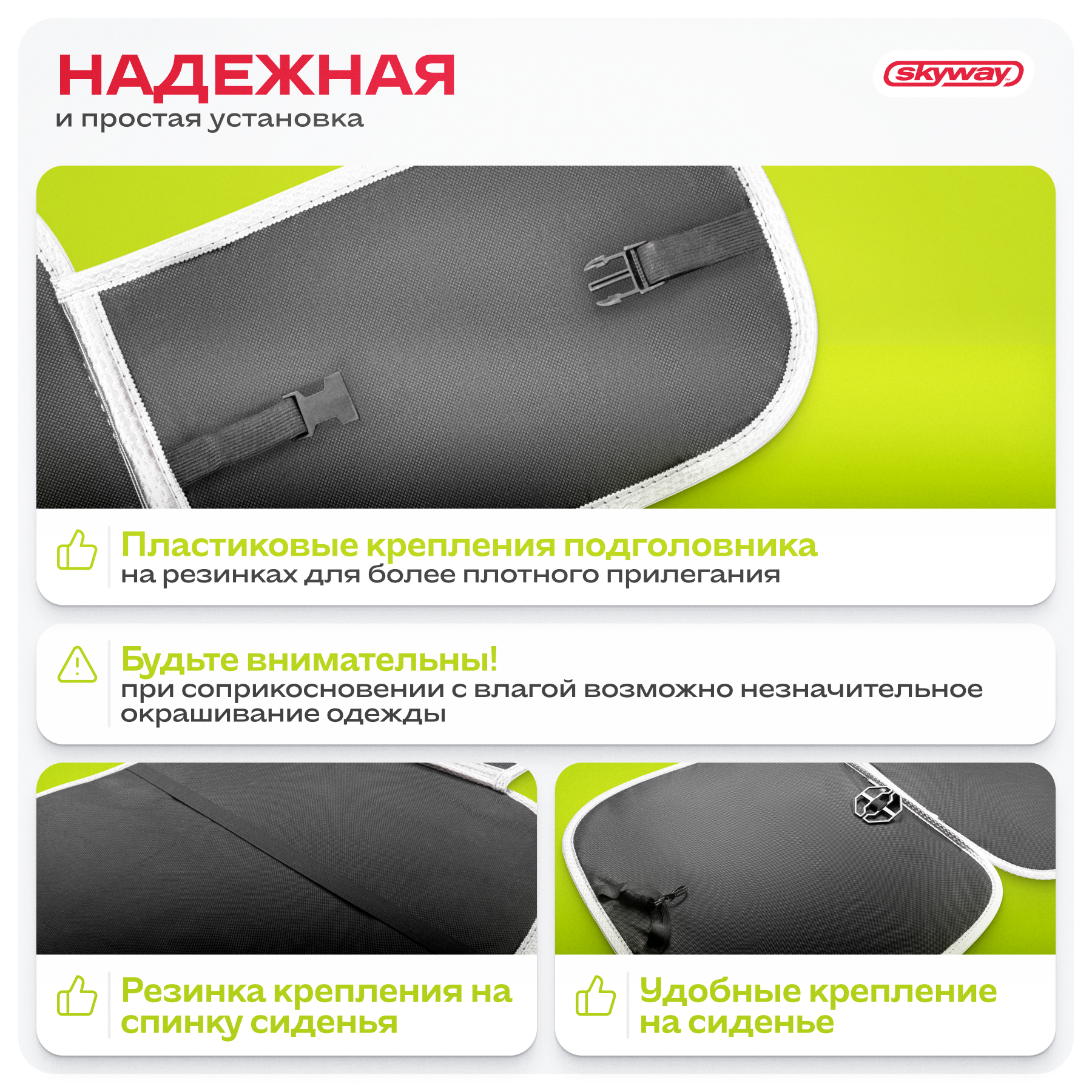 | Дополнительная информация | подложка - ткань оксфорд; крепление - резинки+фастексы; размер изделия: спинка - 55 х 46 см , сиденье - 43 х 45 см (сиденье), подголовник - 34 х 21 см; вес: 620 г; упаковка - п/э пакет с ручкой |