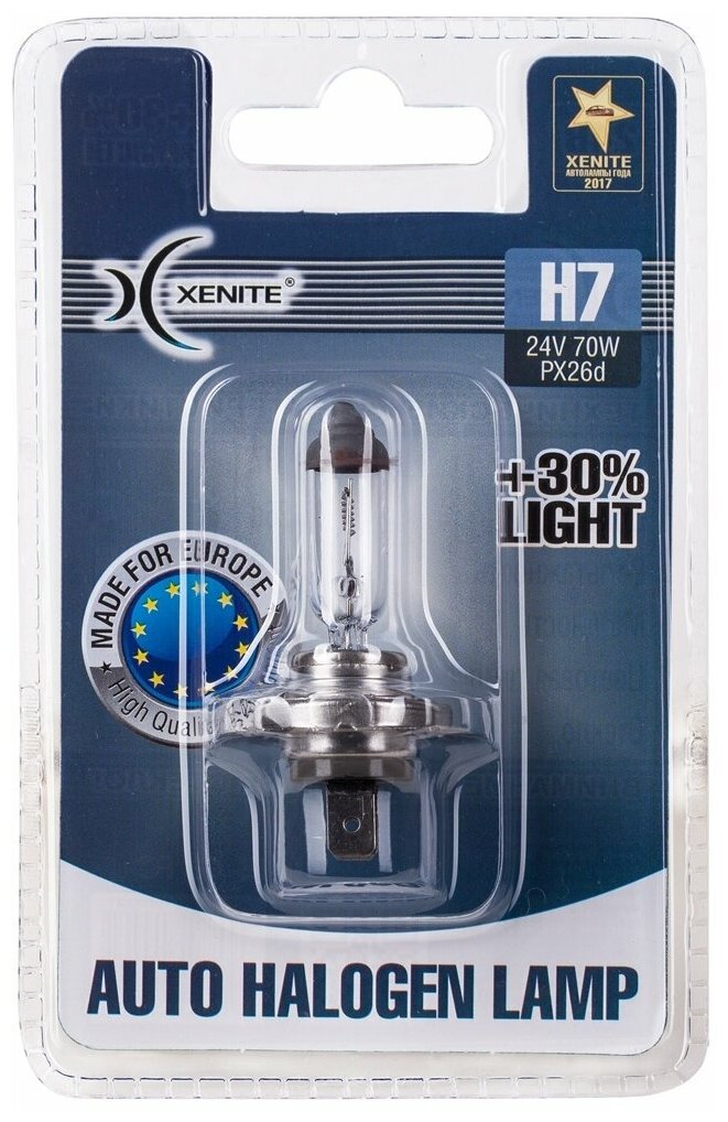 Отзывы на Лампа автомобильная галогенная XENITE H7 (PX26d) (Яркость +30%) 24V 70W (кварцевое стекло) (блистер 1 шт.)