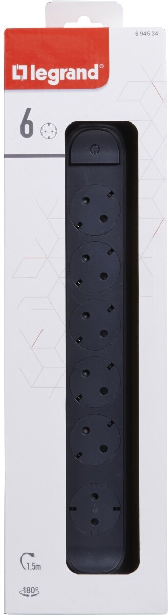 Удлинитель с заземлением Legrand 6 розеток с кабелем 1,5 м, с кнопкой включения и поворотным основанием, цвет: черный , арт. 694534