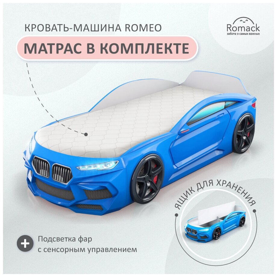 Кровать-машина детская Romack Romeo голубая, с подсветкой фар, ящиком для белья типа книжка, объемными колесами, эко матрасом 70х170 информация: