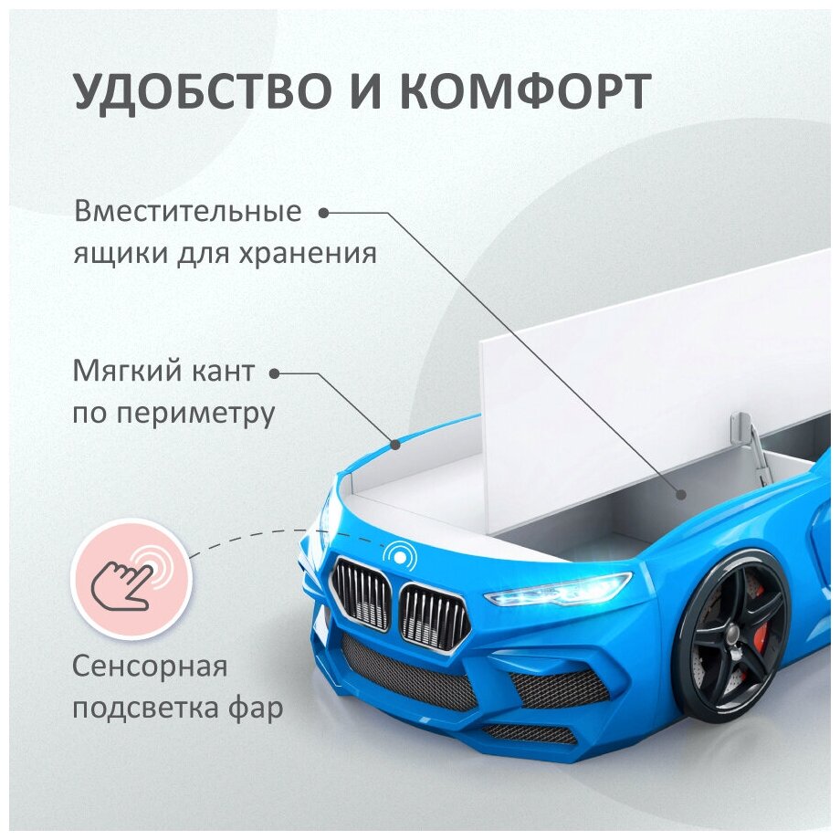 Детская кровать-машина Romeo, цвет голубой, с матрасом, ящиком для белья и подсветкой фар 25 390 ₽